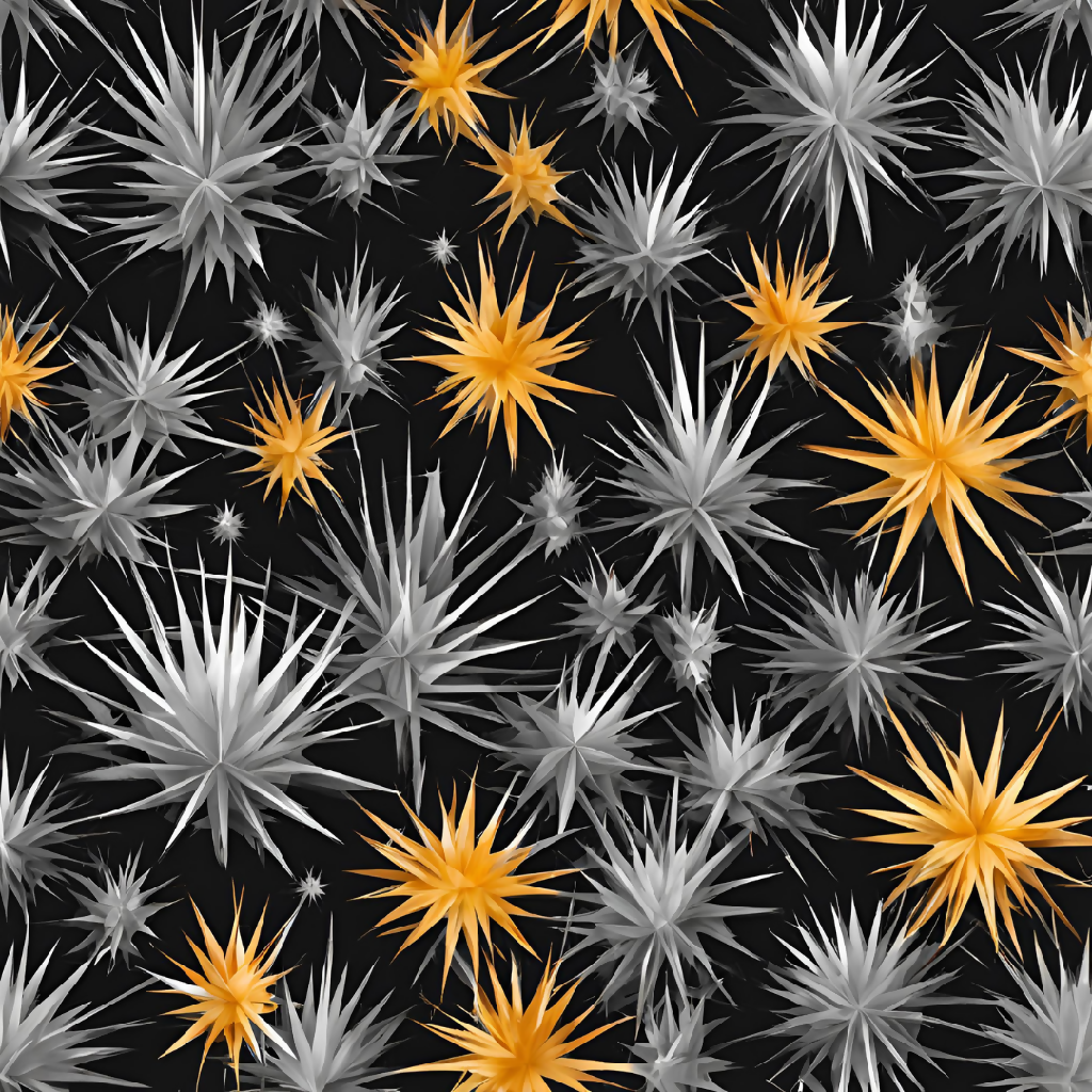 This piece is in a modern abstract and geometric art style, with elements of digital surrealism. The sharp, spiky forms resemble crystalline structures or starbursts, and the contrasting metallic silver and warm gold tones add a sense of depth and dimensionality. The repeating pattern and intricate details also give it a futuristic, sci-fi-inspired aesthetic.