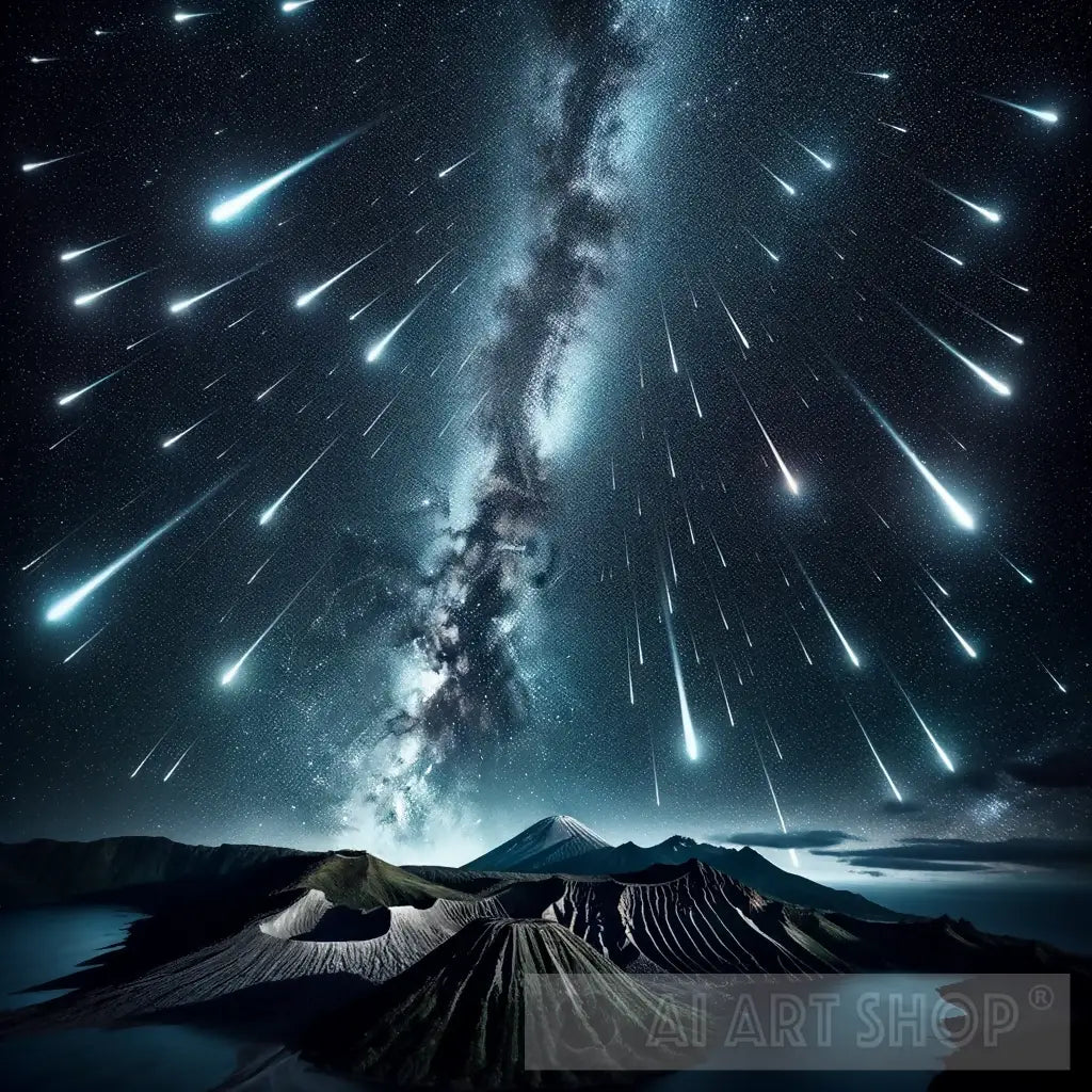 A captivating photo capturing the awe-inspiring moment of a meteor shower against a night sky. Perfect for space enthusiasts and art collectors.