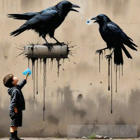 stencil art of a kid with crows