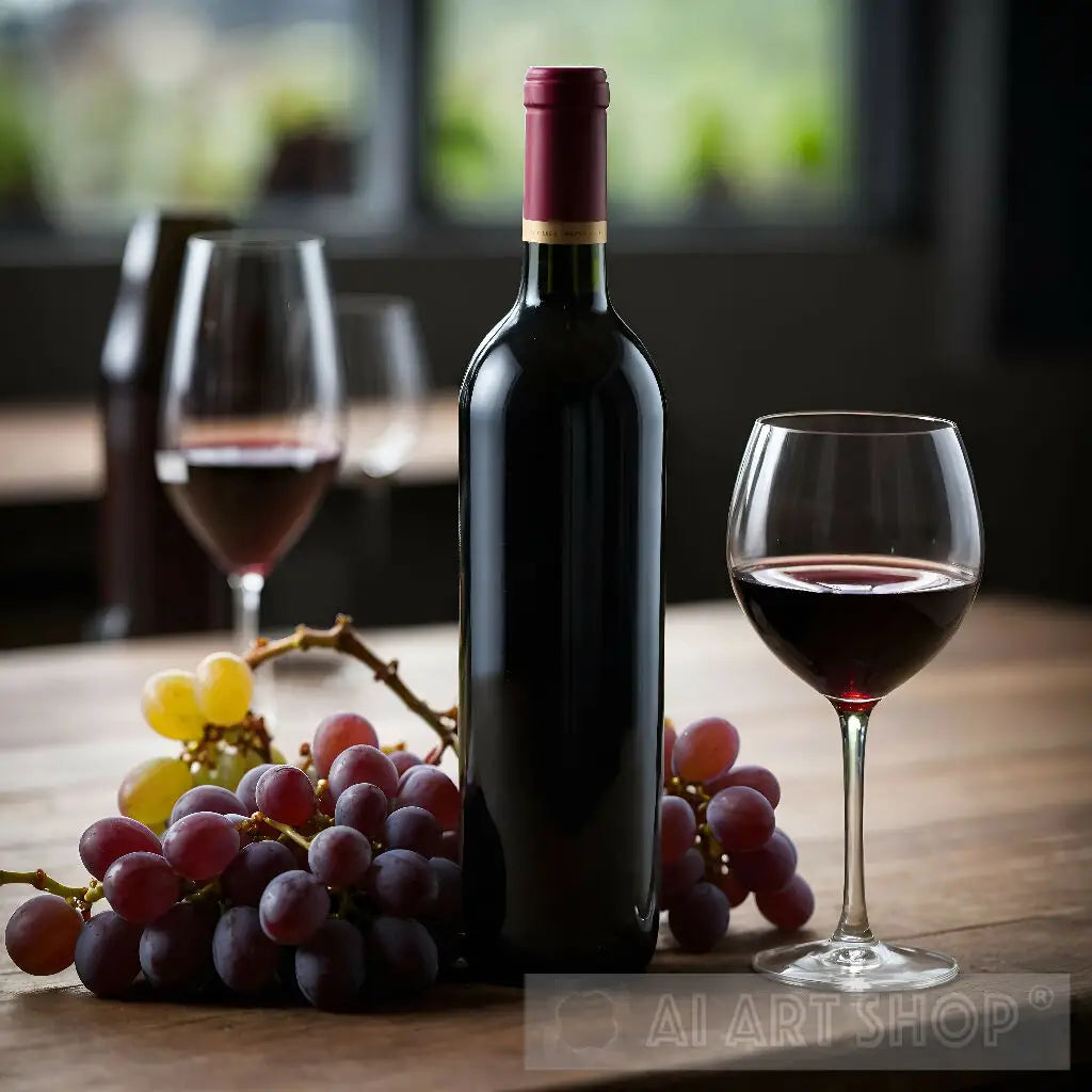 The image features a composition of a bottle of red wine, two filled wine glasses, and a bunch of grapes (both red and green varieties) on a wooden surface. The background is blurred, suggesting an indoor setting with natural lighting.