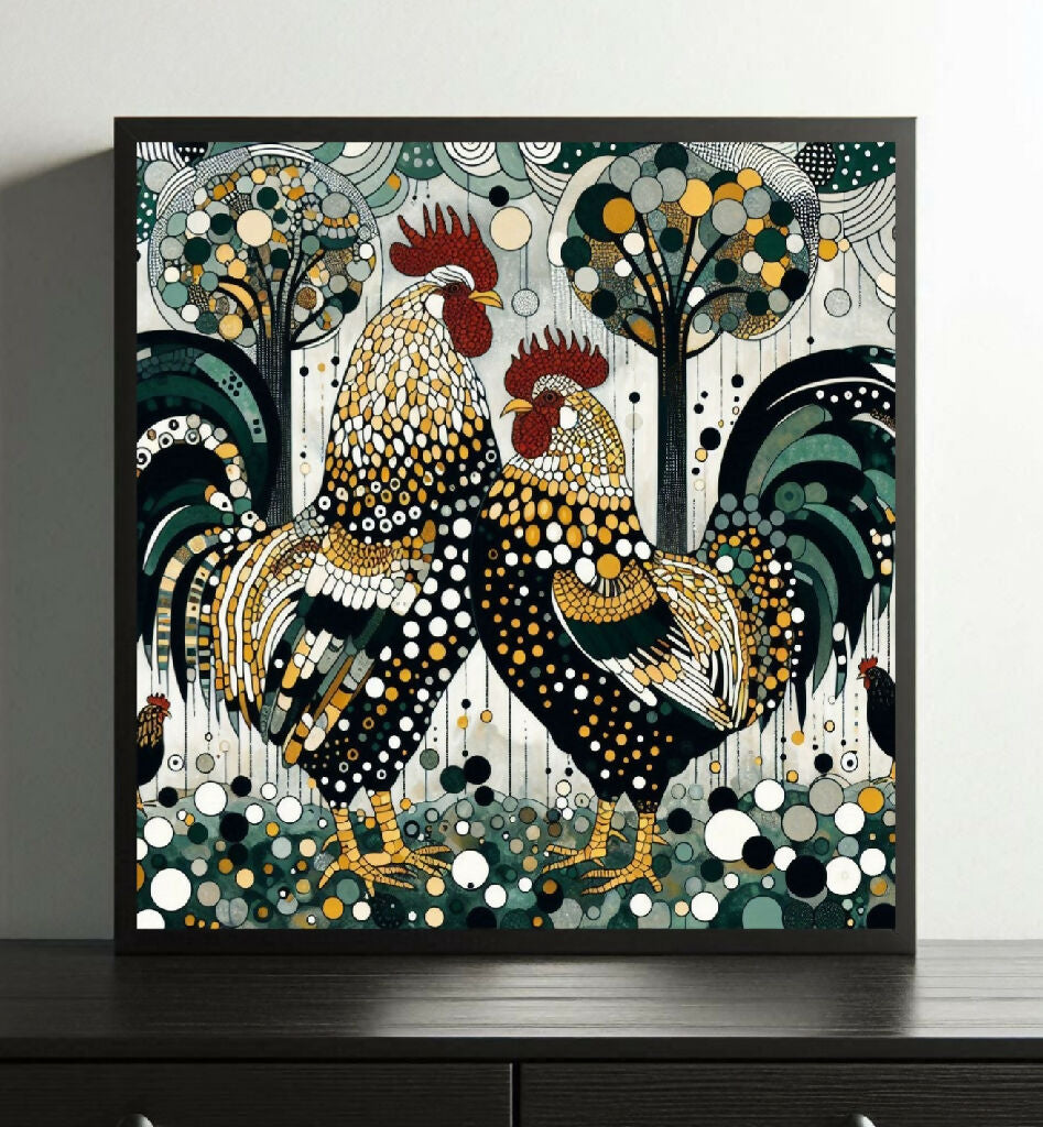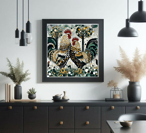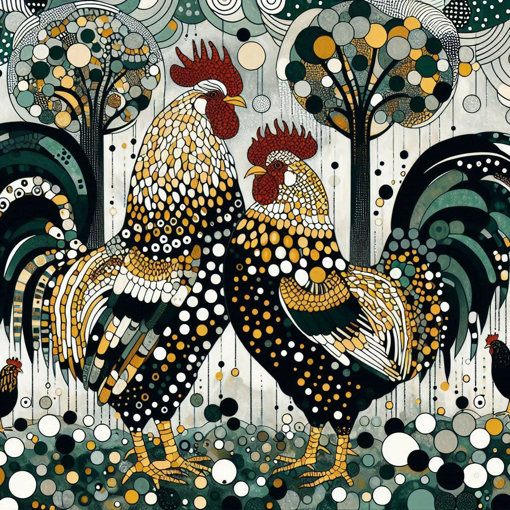Zwei prächtige Hähne, in einem kaleidoskopischen Muster aus Schwarz, Gold und Grün bemalt, stehen nebeneinander vor einem Hintergrund stilisierter Bäume. Ihre Federn schimmern mit Punkten und Mustern, und ihre kräftige Präsenz dominiert die Komposition. Das Gemälde ist gleichzeitig lebendig und ruhig, eine perfekte Mischung aus abstrakter Gestaltung und natürlicher Darstellung. Die Hähne verkörpern Stolz und Würde, während der Hintergrund eine ruhige, nahezu meditative Atmosphäre vermittelt.