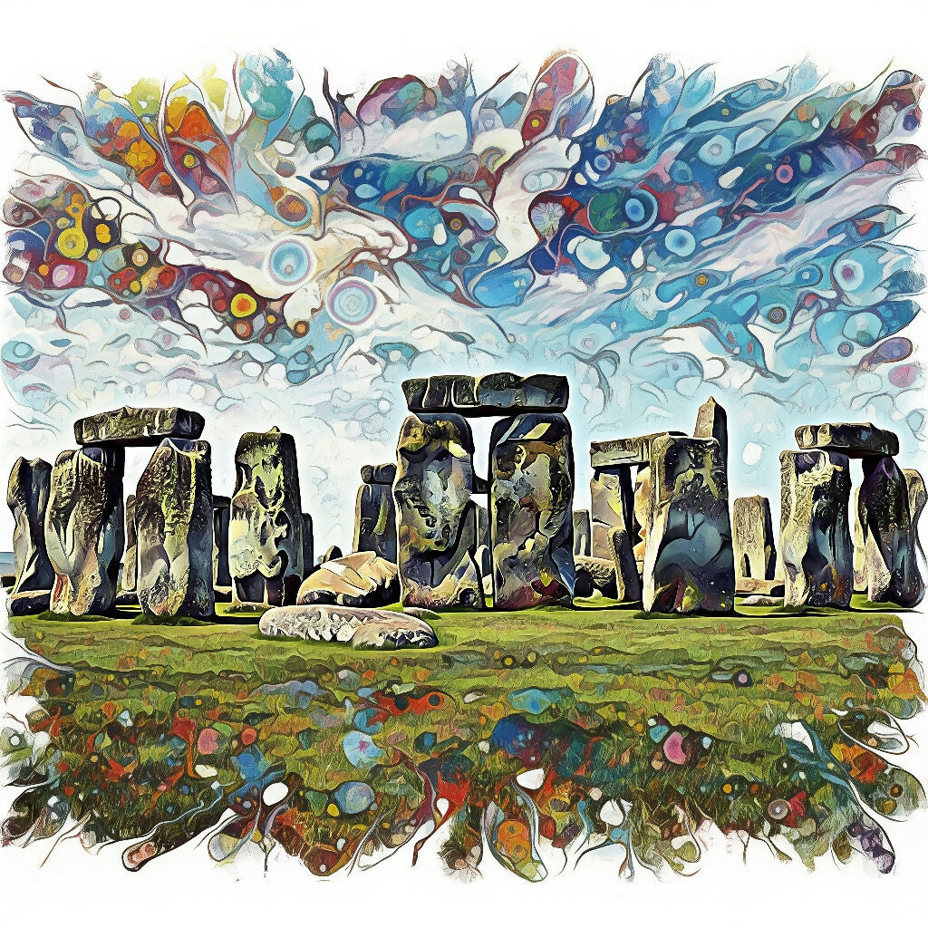 This vibrant image presents a stylized, almost dreamlike interpretation of Stonehenge. The iconic stone circle stands prominently on a grassy field, rendered with a textured, slightly rough painterly effect that suggests the ancient, weathered nature of the stones. Above the monument, the sky is a riot of abstract, swirling colors, reminiscent of a watercolor or digital painting style, with blues, purples, oranges, and yellows blending and flowing together, creating an ethereal and dynamic backdrop. Below the stones, the grassy foreground is mirrored by a colorful, almost liquid reflection, where the vibrant hues from the sky seem to have dripped and splattered, creating an abstract, organic pattern that beautifully complements the sky. The overall impression is one of a contemporary, artistic take on a historical landmark, full of movement, color, and a sense of wonder.
