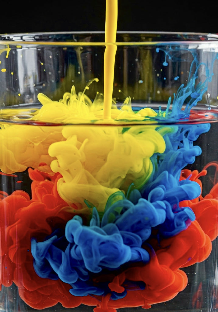 Colors of paint being poured into a glass of water, forming clouds of paint like a storm before the calm.