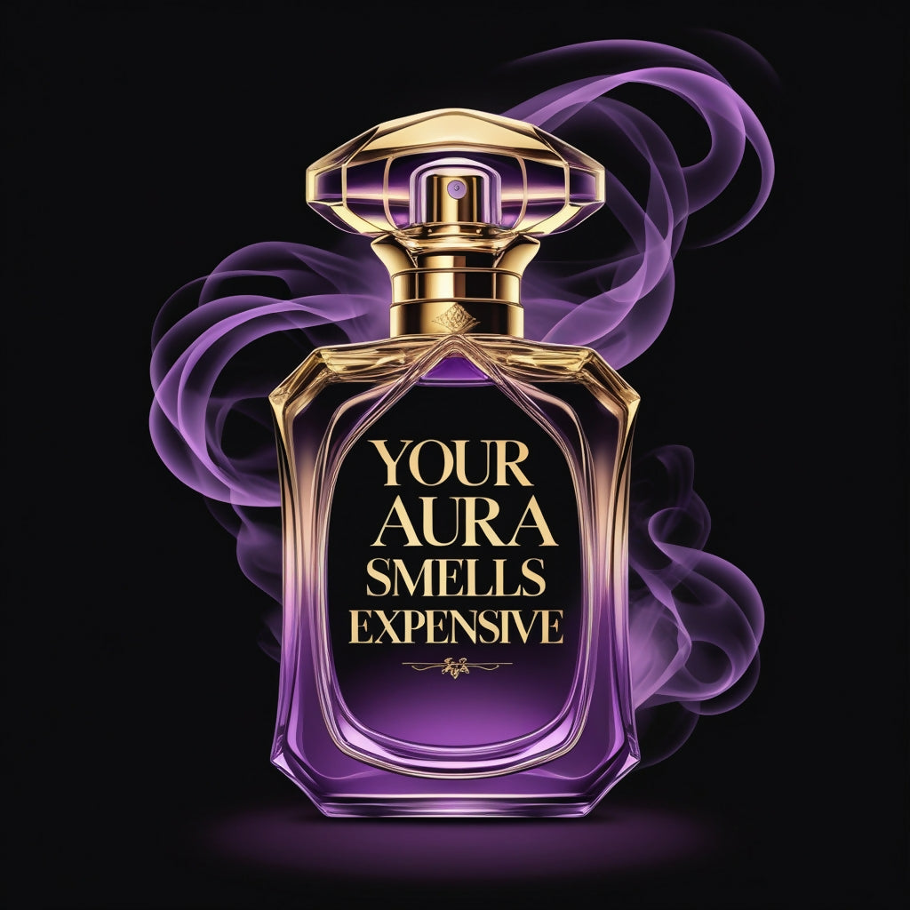 Stylized perfume bottle with intricate golden accents and a purple ombre effect emitting soft glowing smoke that swirls around the bottle in a luxurious manner, bold serif text Your Aura Smells Expensive in gold with subtle purple undertones, set against a dark black background that allows the gold and purple hues to take center stage, luxury editorial vector design with clean lines and elegant typography, perfectly suited for a high-end tote bag or t-shirt print with a focus on sophisticated aesthetics and attention to detail.