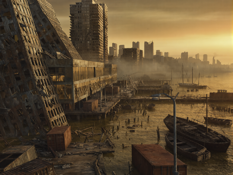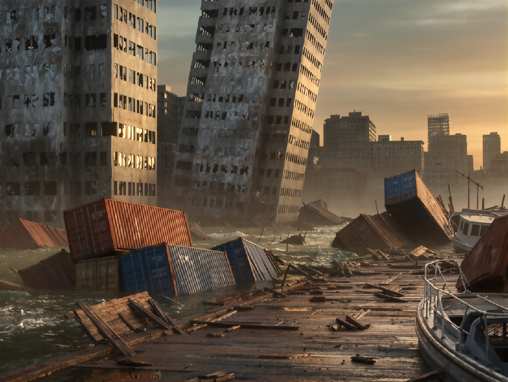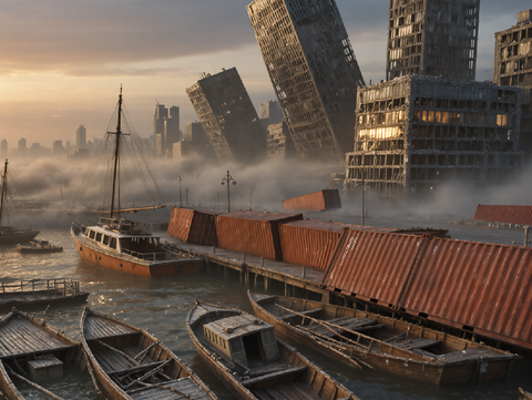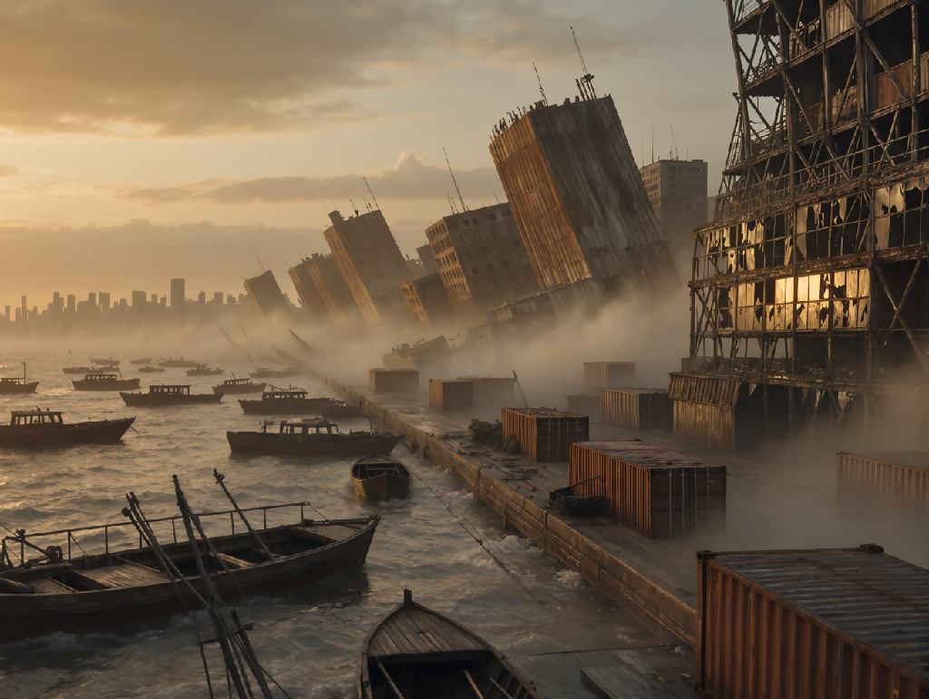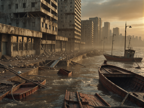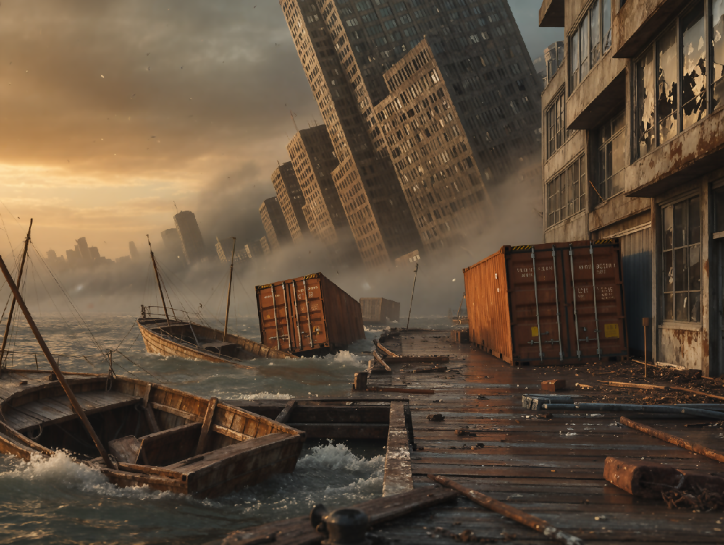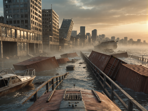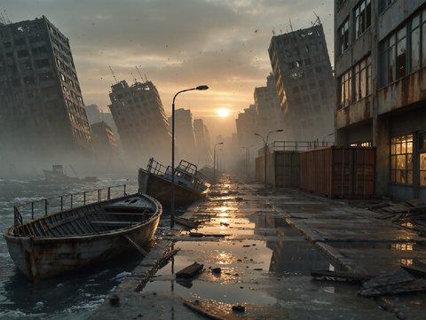 A surreal visual narrative of a world abandoned. This piece evokes desolation through mist-veiled towers, shattered docks, and drifting cargo. Ideal for mood boards, set design references, or as a powerful wall art print.