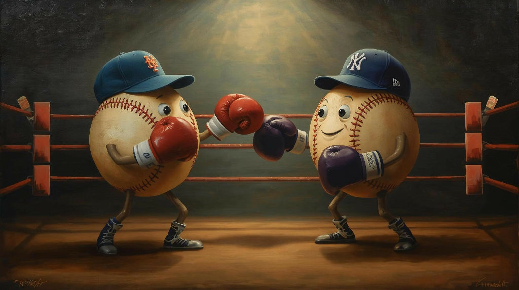 Humorous, surreal of a New York Mets and New Yankees baseball battling it out in the ring.