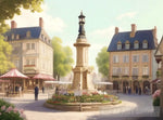 This artwork depicts a summer scene in a European style town plaza. Well-tended flowers bloom around the memorial in the center of the square. People are walking and chatting leisurely.The entire square appears exceptionally tranquil and relaxed in the summer afternoon sunlight.
