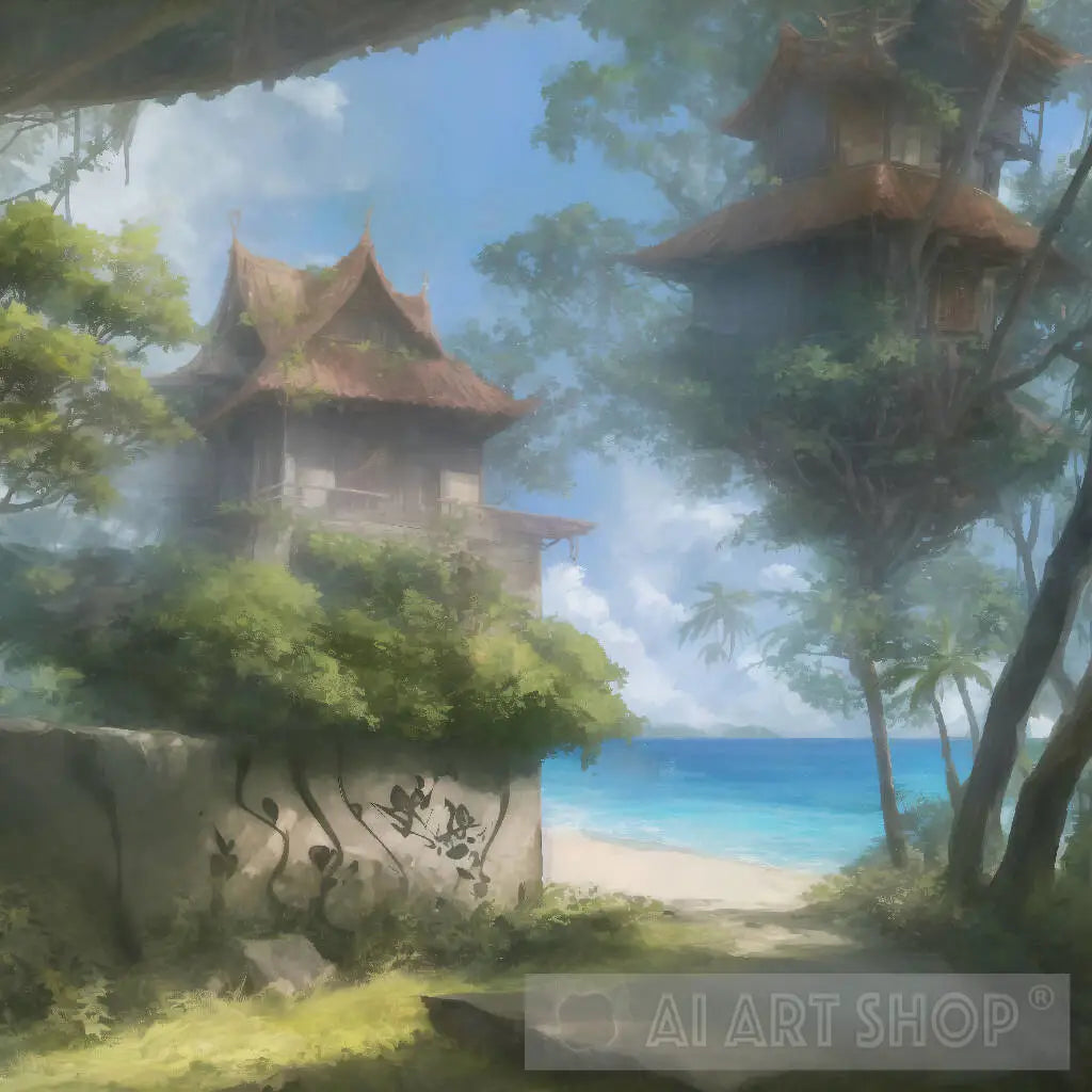 Subject : A Treehouse village, on the beach side, with graffiti,