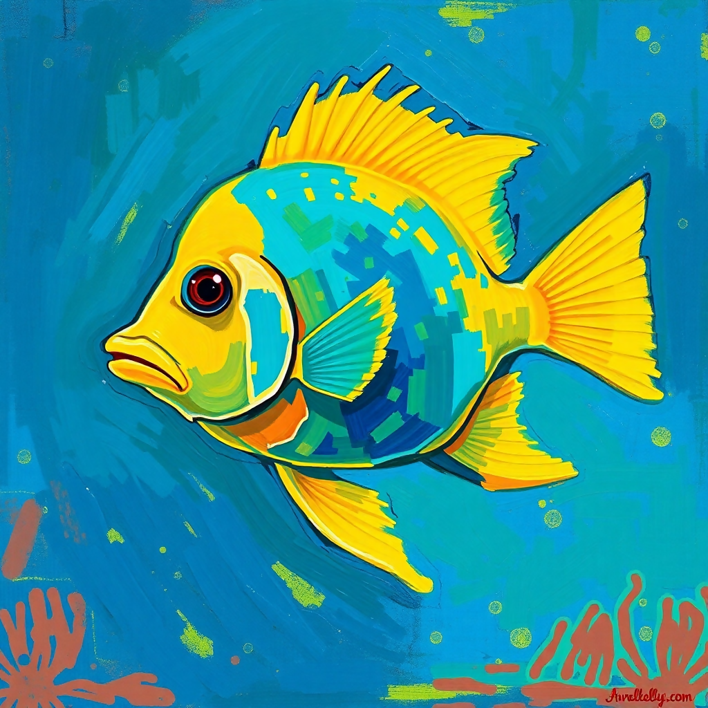 A radiant yellow fish glides effortlessly through the deep blue water, its sleek body cutting through the tranquil currents like a streak of liquid sunlight. The rich sapphire hues of the aquatic surroundings amplify its vivid glow, creating a mesmerizing contrast. Tiny bubbles trail in its wake, adding a sense of motion and life to the serene underwater world. The play of light on its shimmering scales suggests both energy and grace, as if this lone fish carries the warmth of the sun into the ocean’s mysterious depths.