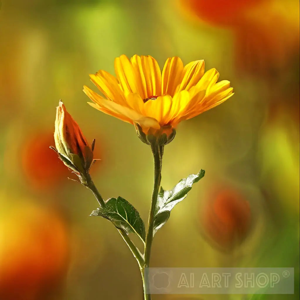 This close-up of a vibrant yellow flower captures the delicate beauty of nature's promise. The bud, nestled behind the bloom, hints at the potential for new beginnings and growth. The soft light bathing the flower creates a sense of warmth and optimism, making it a perfect piece to brighten any space.