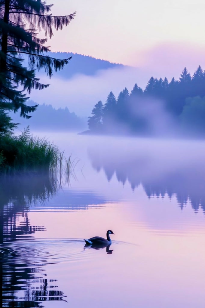 A duck sails solo on the water as the sun rises, leaving a few nice shades of purple.
