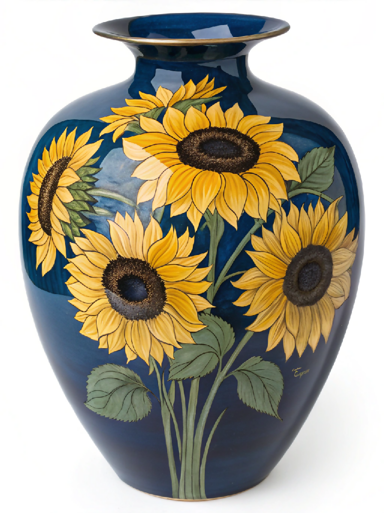 This striking ovoid vase showcases a vibrant arrangement of sunflowers against a rich, deep blue background. The bright yellow petals and dark centers of the sunflowers create a beautiful contrast with the cool blue, evoking a sense of warmth and cheerfulness. The artist's attention to detail is evident in the delicate rendering of the petals and leaves, bringing the floral design to life. The vase features a classic ovoid shape with a slightly flared neck, finished with a subtle metallic rim that adds a touch of elegance. This piece would make a stunning focal point in any room, celebrating the beauty of nature.