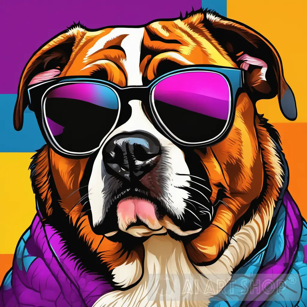 Introducing "Sunglasses Swagger - Stylish Dog Pop Art" - a compelling and vivid painting that gives any environment a dash of flair. A sophisticated dog wearing fashionable sunglasses is depicted in this amusing pop art print, exhibiting a certain mix of charm and confidence.