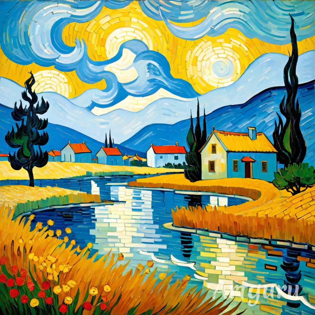 Sunlit Serenity by the River represents the quiet resilience of joy amidst the chaos of life. The swirling skies echo emotional turbulence and the ever-changing nature of the human mind, yet below them, the village remains still—bathed in sunlight and surrounded by growth.