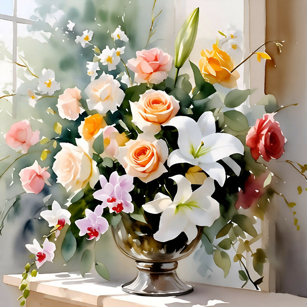Step into a moment of quiet elegance with Sunlit Serenity, a digitally rendered still life that captures the timeless beauty of nature indoors. This AI-generated artwork features a vibrant bouquet of lilies, roses, daisies, and orchids, arranged in a glass vase with a metallic base, basking in the soft glow of morning light.