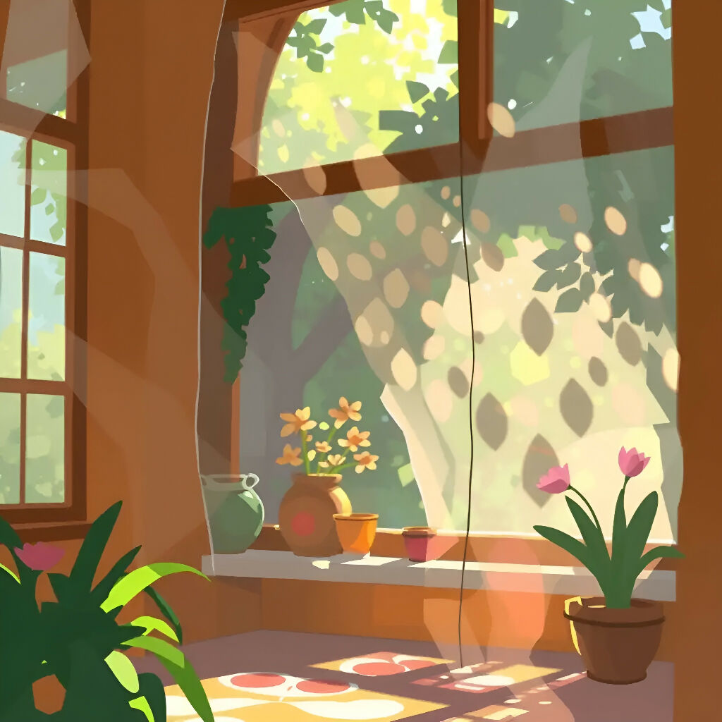 - Light-drenched interior scene with lush plants, soft shadows, and glowing color blocks