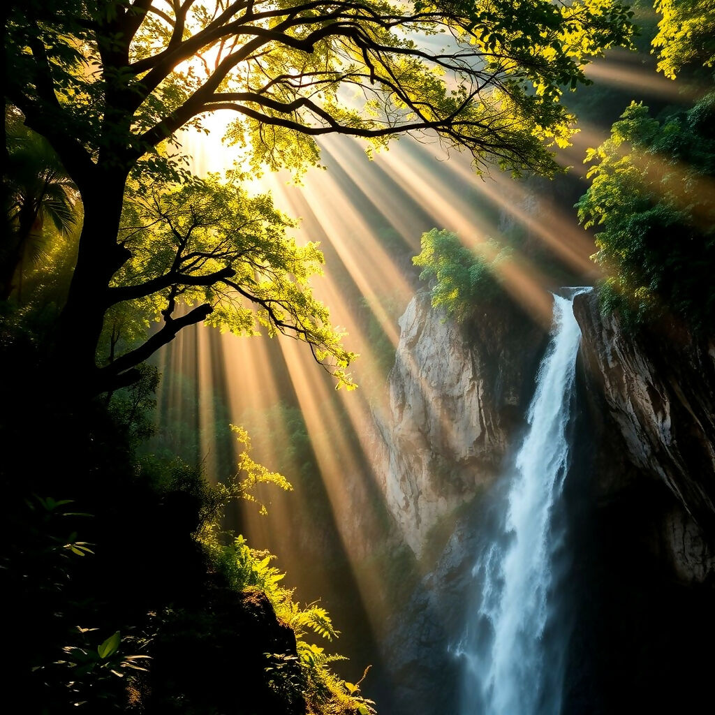 This captivating AI-generated artwork captures a waterfall cascading down rugged cliffs, surrounded by dense, verdant foliage. Sunbeams pierce through the forest canopy, illuminating the mist and creating a magical interplay of light and shadow. The scene evokes tranquility and wonder, celebrating the raw beauty of untouched nature. Ideal for lovers of serene landscapes and atmospheric digital art.