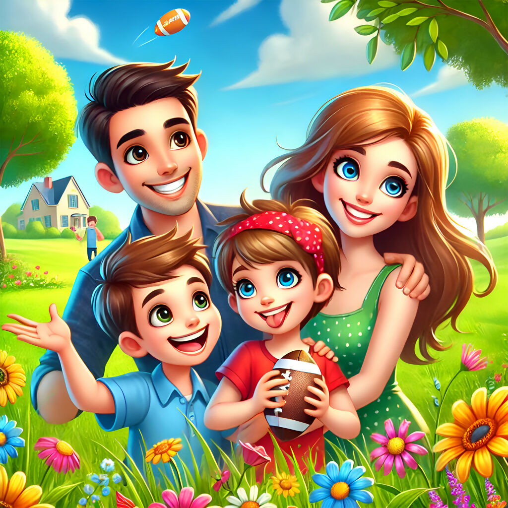 Capture the essence of joyful family moments with our Sunny Family Fun AI Art Print. This vibrant artwork features a picturesque scene of a family enjoying a sunny day outdoors. The lush green landscape, colorful flowers, and playful elements like a football in mid-air create a lively and heartwarming atmosphere. Perfect for brightening up any room, this AI-generated art print brings a touch of happiness and togetherness to your home decor.