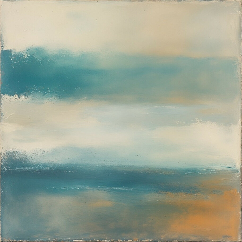 One might interpret this as a serene seascape, where the vast expanse of the ocean meets the sky, or perhaps a tranquil skyscape at dawn or dusk, capturing the ethereal play of light and colour.