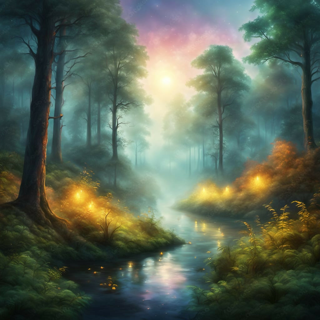 Golden mist dances over a forest stream as dawn breaks, lighting the trees and water with a warm, otherworldly glow — where nature awakens in quiet splendor.