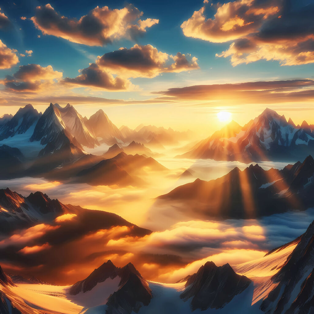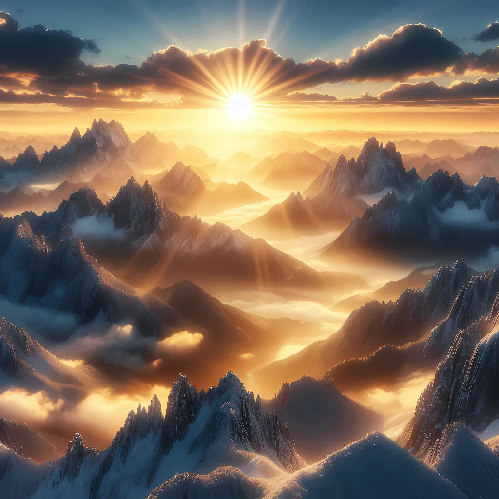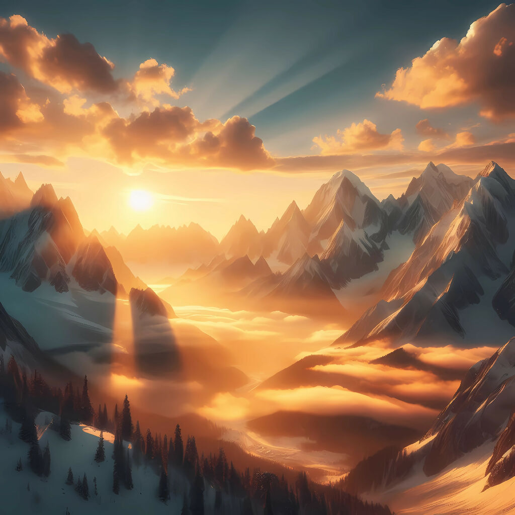 Sunrise Kisses over Snowy Peaks As dawn unfolds its golden breath, the first light caresses the frozen crowns of distant mountains—soft and tender, like a whispered promise. The snow glows in hues of blush and amber, each peak blushing beneath the sun's gentle touch. Mist curls lazily in the valleys, rising like sighs of sleep turning into day. It’s a moment where warmth meets frost, where the world inhales light for the first time—silent, sacred, and fleeting as a kiss upon winter’s brow.