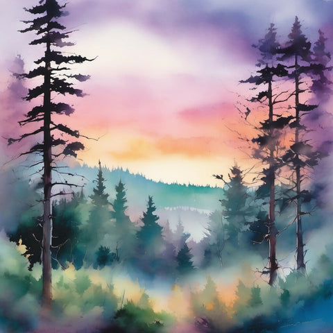 "A stunning watercolor painting of a vibrant sunrise casting a mesmerizing glow over a dense forest of tall pine trees. The sky is awash with brilliant hues, transitioning from deep magenta and fiery orange near the horizon to soft pastel pinks and gentle lavender tones higher up. These radiant colors reflect onto the tips of the towering dark green pines, creating a striking contrast between warm and cool tones.