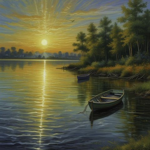 Two small wooden boats are by the edge of a calm lake, surrounded by trees. The scene is bathed in soft, golden light as the sun rises or sets, casting a serene and tranquil atmosphere.