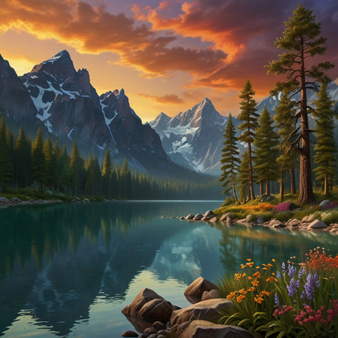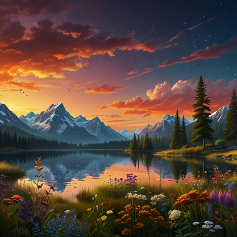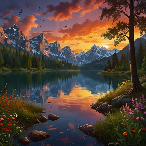 Step into a breathtaking world where magic and nature intertwine in perfect harmony. This exquisite digital masterpiece captures a serene sunset over a mystical landscape, where towering mountains meet an enchanted forest glowing with shimmering leaves. A crystal-clear lake mirrors the vibrant, golden sky, while delicate, luminous butterflies and ethereal fairies dance gracefully through the scene. The blend of realistic detail and surreal beauty creates a peaceful, dreamlike atmosphere that invites you to pause, reflect, and escape. Perfect for adding a touch of wonder and tranquility to any space, this artwork transforms any room into a sanctuary of timeless elegance and enchantment.