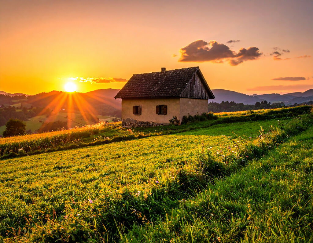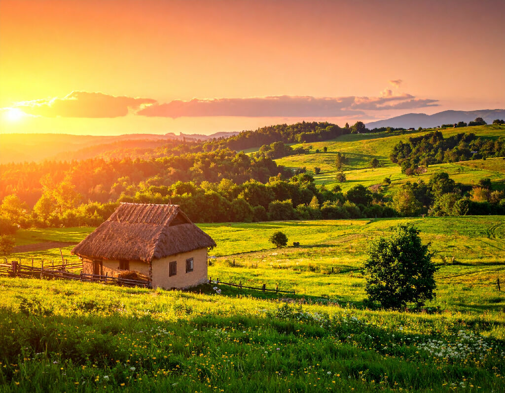The scenes are set in a hilly region, possibly a mountainous foothills or a broad valley, characterized by lush, vibrant green meadows and dense pockets of forest. The land is rugged yet inviting, with the grassy fields sweeping up and down the slopes. The atmosphere is intensely warm and tranquil, dominated by the "golden hour" before sunset