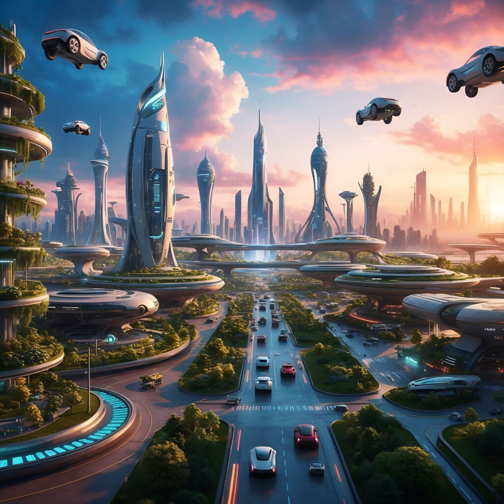 Immerse yourself in a breathtaking illustration of a futuristic cityscape where innovation meets vibrant urban life. This captivating scene features cutting-edge architecture, advanced transportation systems including flying cars; and lush green spaces seamlessly integrated with technology. As the sun sets, the skyline glows with promise, symbolizing hope and progress in a dynamic sci-fi environment. Discover a world where creativity and technology converge, painting a vivid picture of the cities of tomorrow.