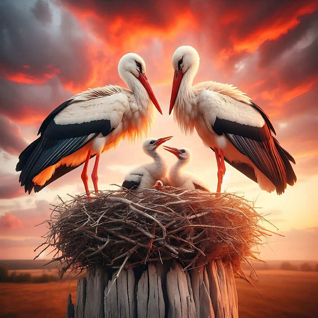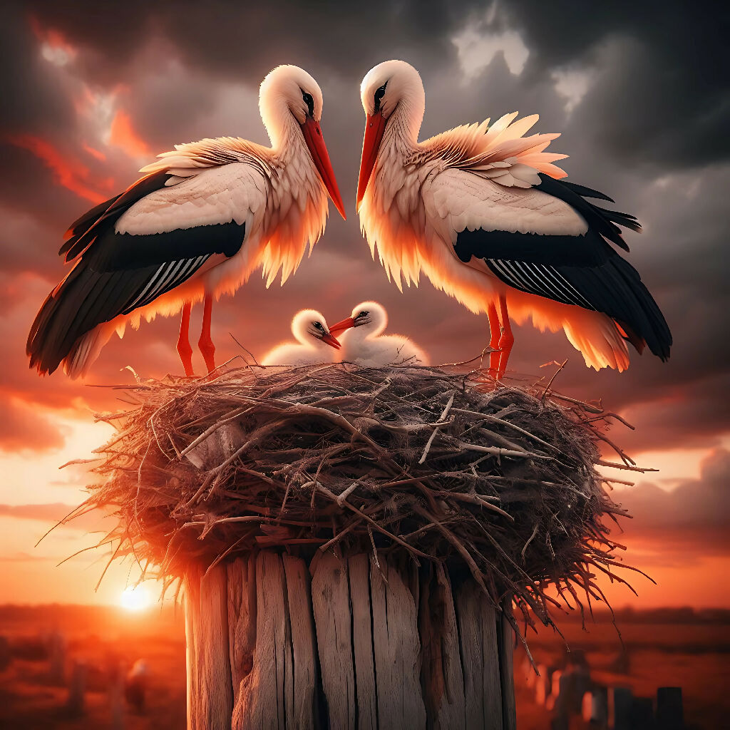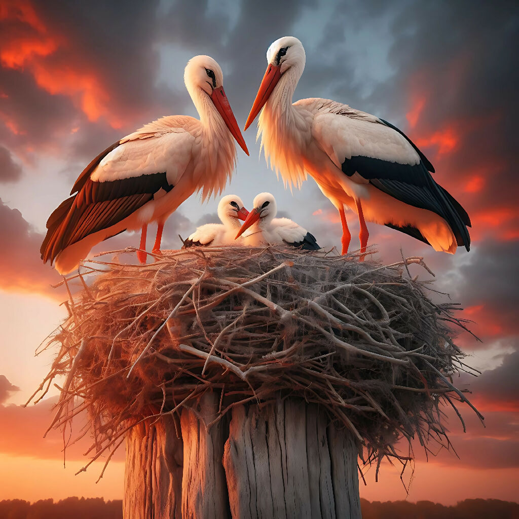 Two adult storks, white with reddish-orange markings on their wings and beaks, are perched atop a nest, positioned centrally in the image.  They are facing each other, seemingly interacting. A smaller stork chick is nestled within the nest, alongside the adult birds. The nest is constructed from brown twigs and branches, sitting atop a weathered, light gray-brown tree stump. The birds and nest are the focal point against a backdrop of a vibrant sunset sky, with a large, fiery orange sun or moon.  The sky is filled with clouds of orange, pink, and dark red hues. The composition is balanced and natural, showcasing the birds in relation to their nest and the surrounding environment. The lighting is dramatic, highlighting the details of the birds' feathers and the texture of the nest.  The overall style is realistic, with meticulous detail and strong color saturation, evoking a sense of warmth and tranquility.