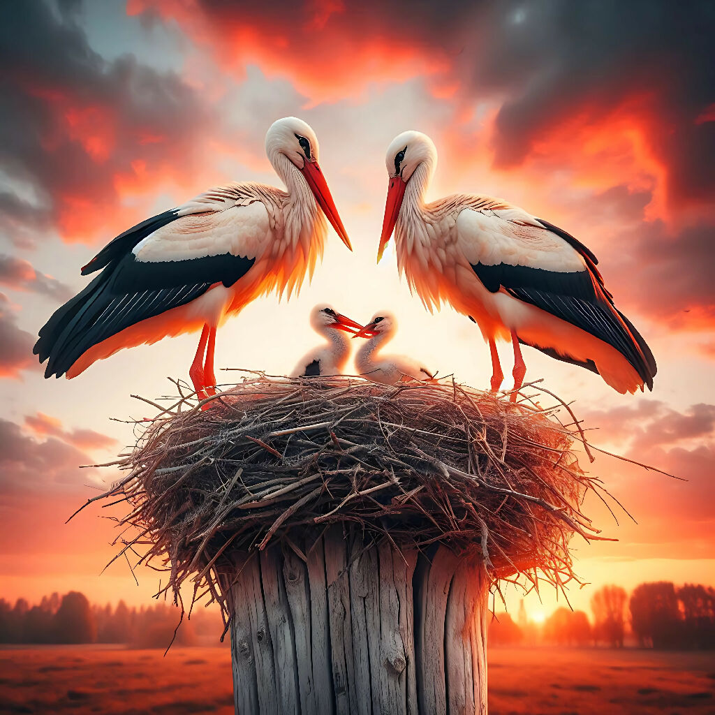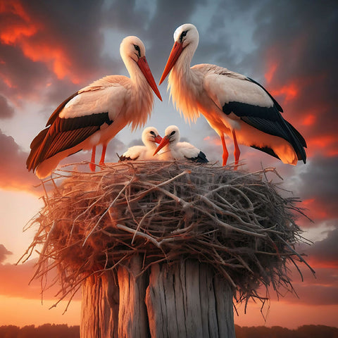 "Sunset Nesting: A Family of Storks Beneath the Fire Sky"