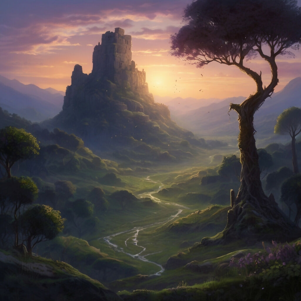 "A hidden valley at dusk, where ancient ruins overgrown with twisting vines emerge from lush, secluded greenery. Soft twilight hues of deep purples and blues wash over the scene, while countless fireflies dance around the crumbling stone structures, leaving trails of gentle, glowing light. The atmosphere is mystical and secret, as if the valley holds forgotten stories from a long-lost civilization."