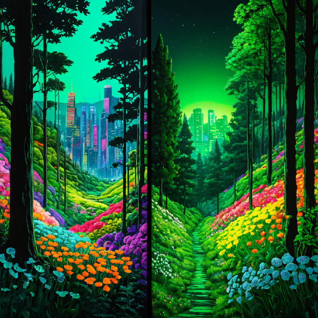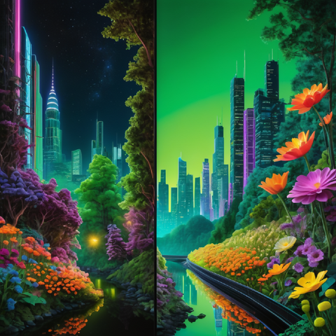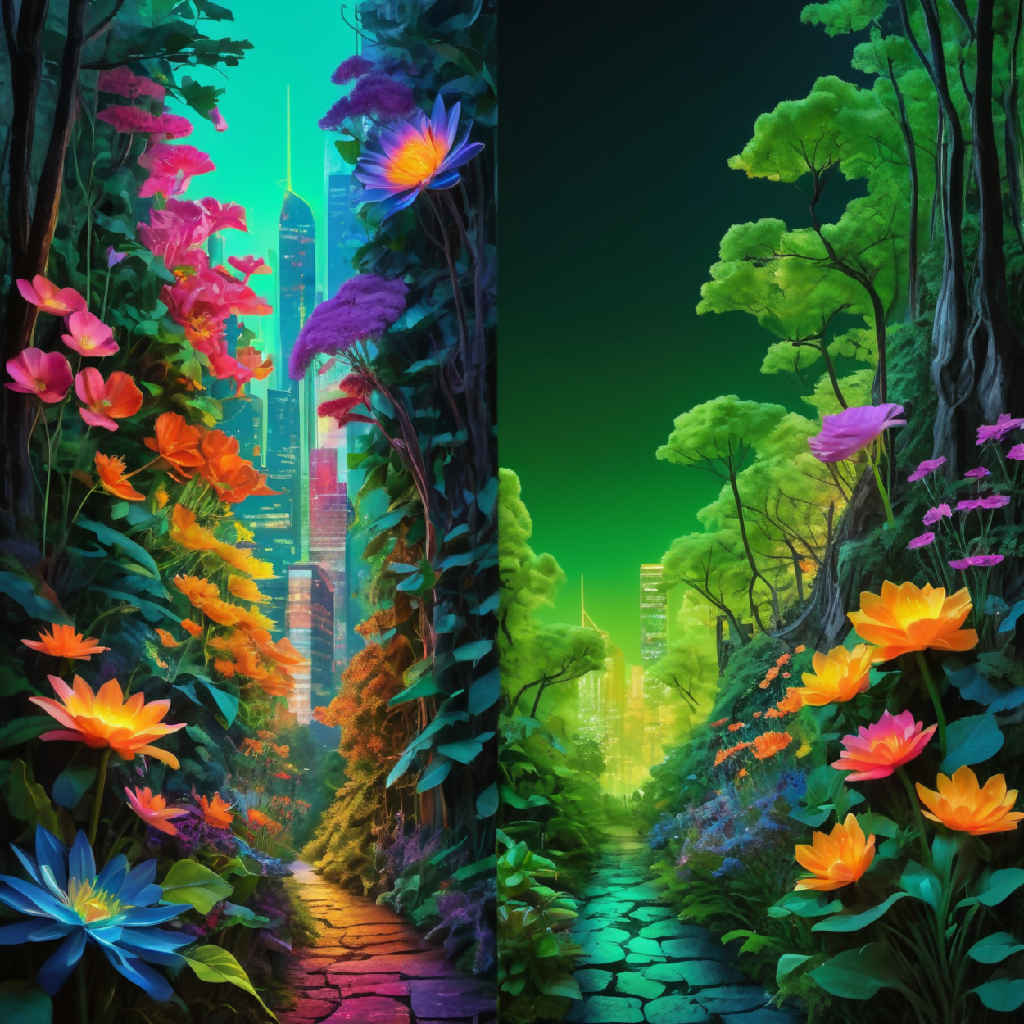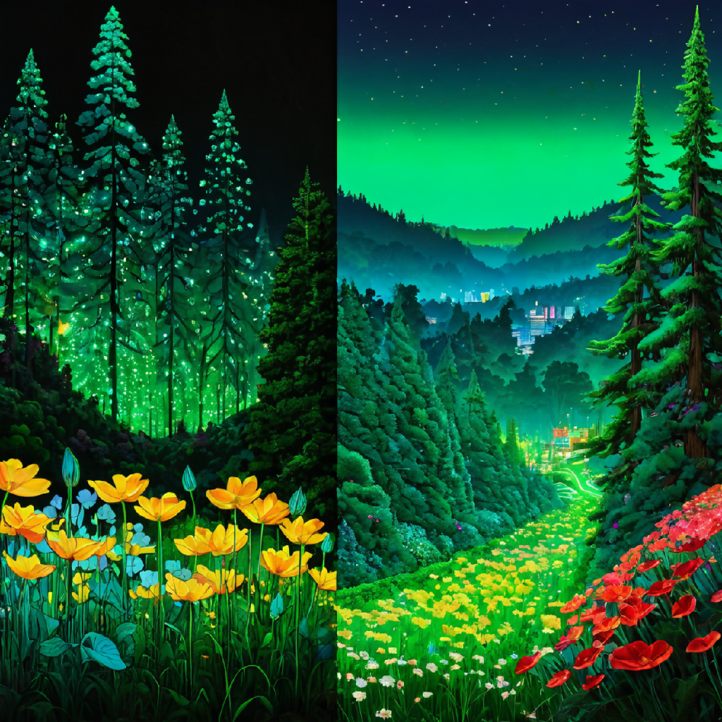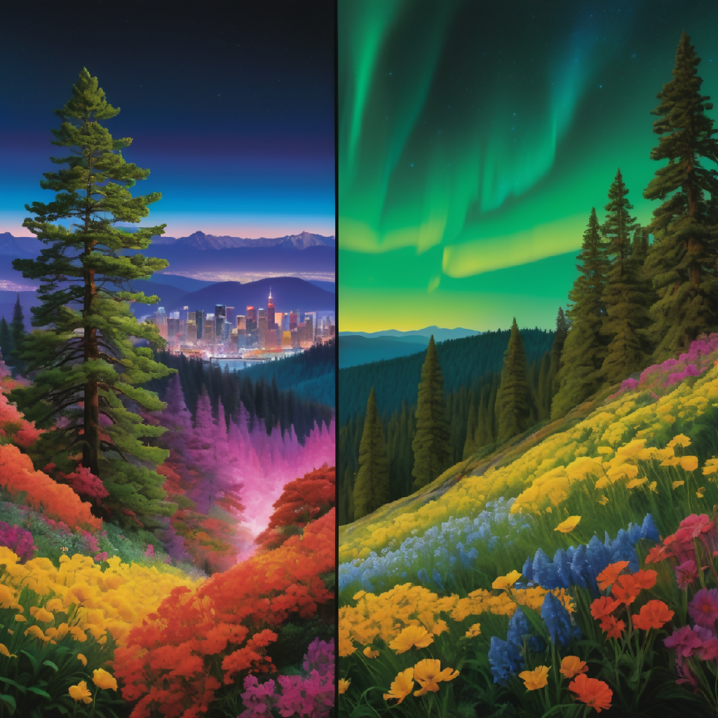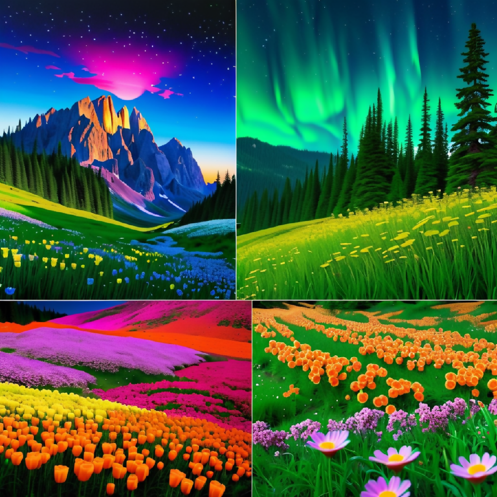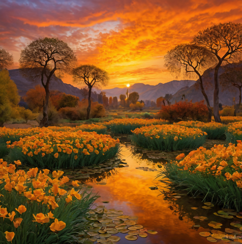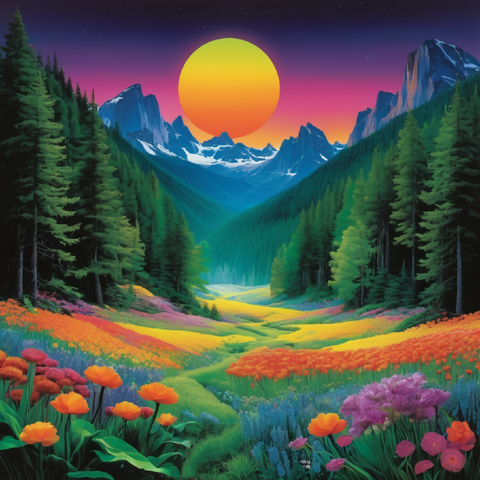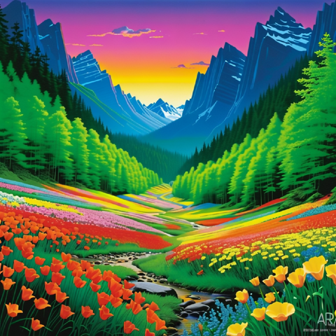 This image is a vibrant, stylized landscape painting featuring a dramatic mountain range with sharp peaks, bathed in the warm hues of a sunset sky transitioning from orange to purple. The foreground is dominated by a lush valley filled with a diverse array of colorful flowers, creating a patchwork of reds, pinks, yellows, blues, and greens. A gentle stream winds its way through the valley, bordered by stones and leading the eye towards the towering mountains in the background. The scene is framed by dense, green coniferous forests on either side, adding depth and contrast to the composition. The overall effect is one of serene beauty and vibrant natural splendor.