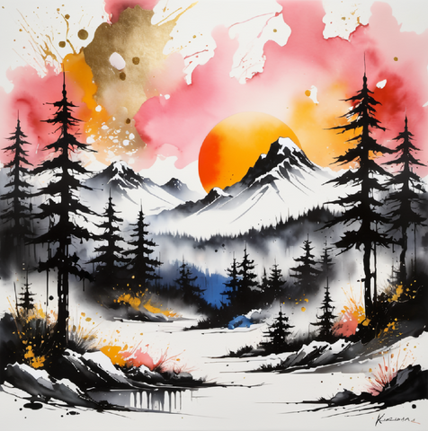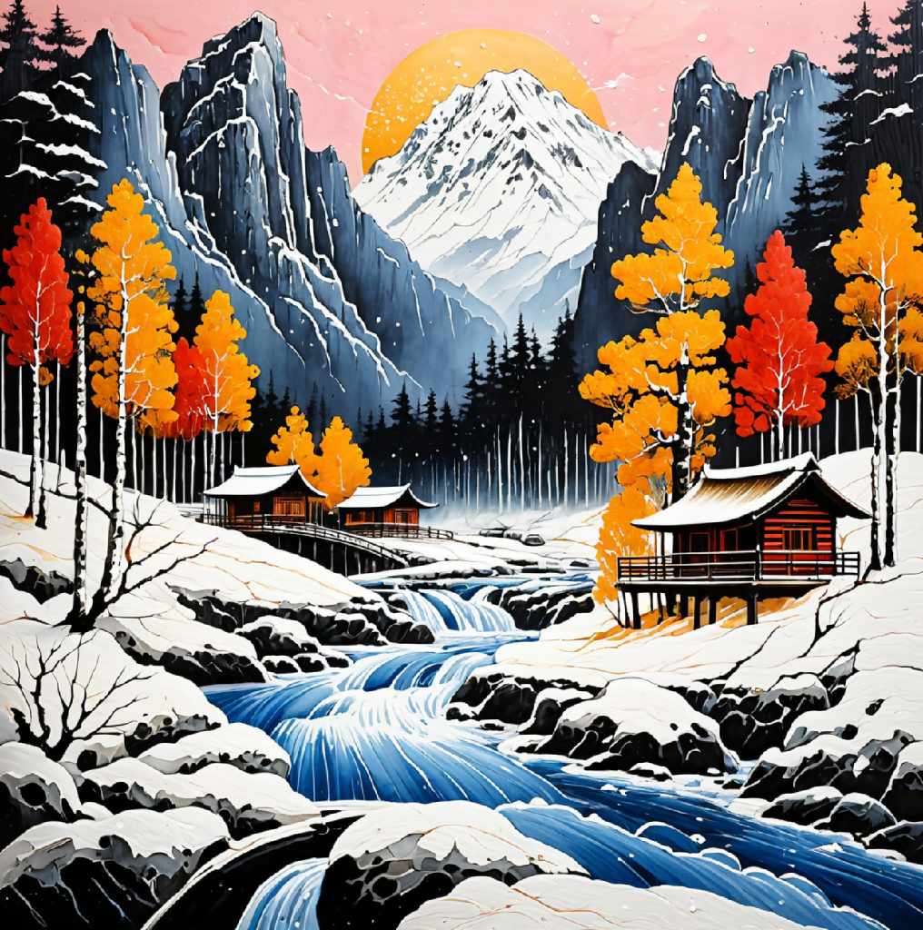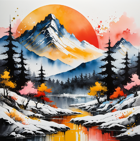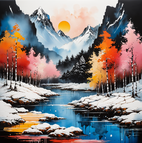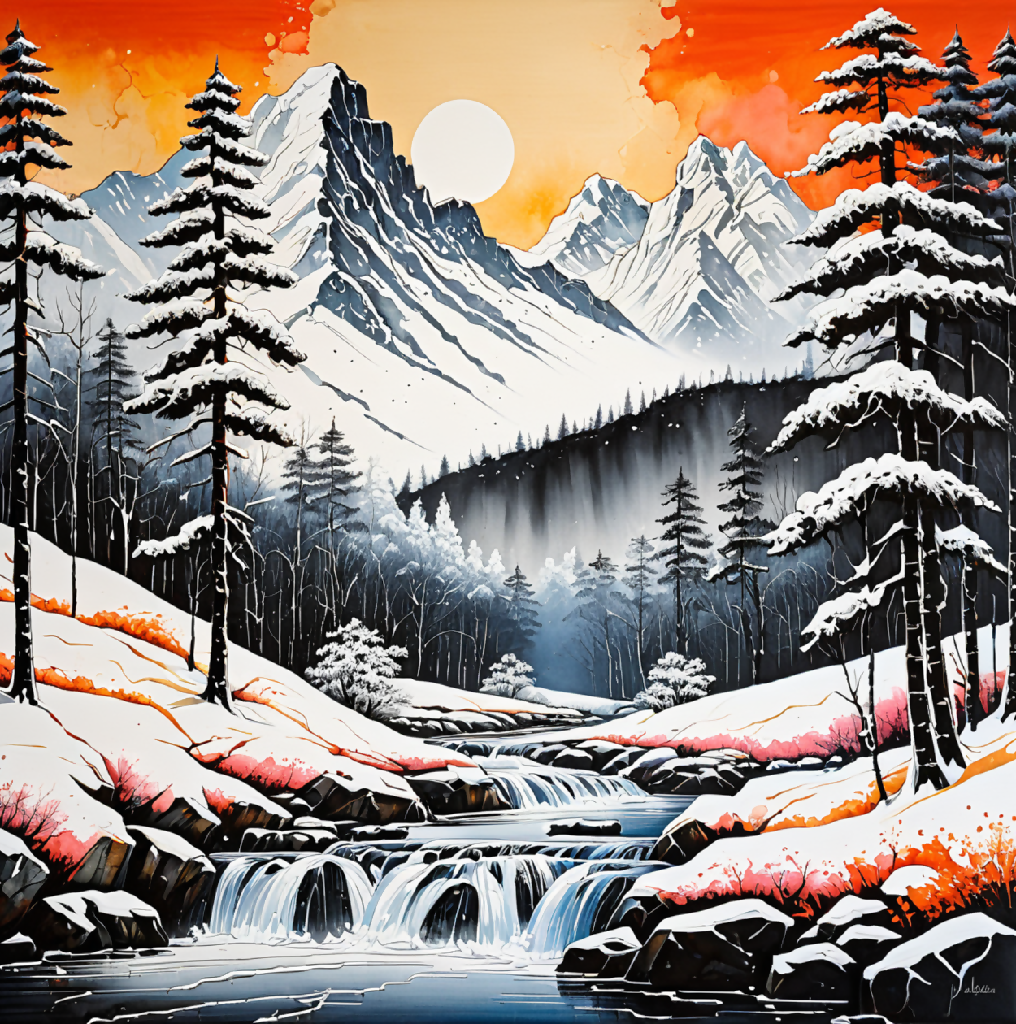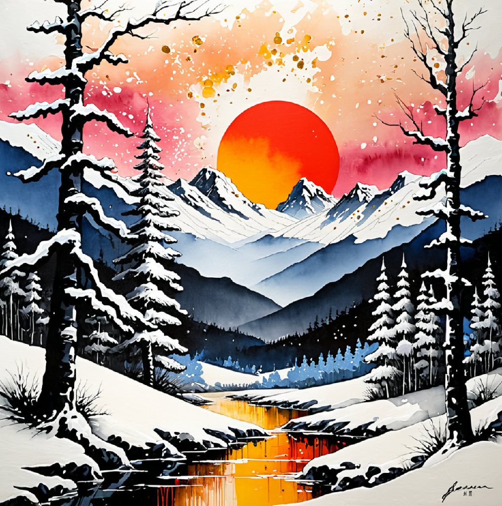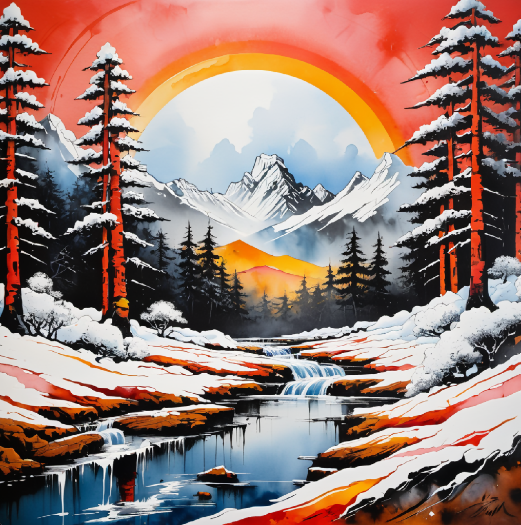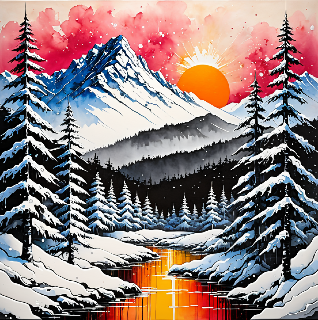 A vibrant winter landscape featuring snow-covered evergreen trees framing a tranquil river reflecting the fiery hues of a vivid sunset. Majestic mountains rise in the background, accented by a dramatic red and orange sky.