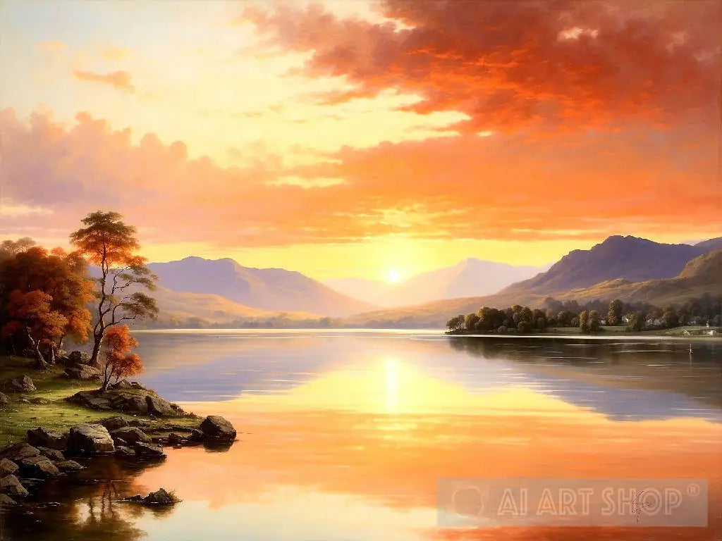 The serene waters of Lake Windermere reflect the fiery colors of the setting sun. Montague’s delicate brushwork captures the play of light on the water and the surrounding hills, creating a scene of peaceful beauty and tranquility.