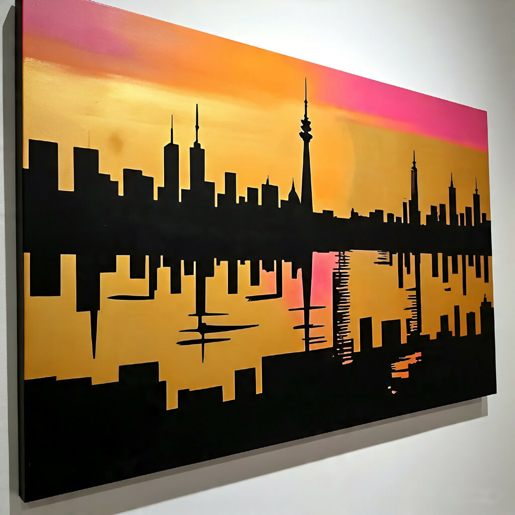 A mesmerizing digital painting that captures the soul of a city at twilight. Sunset Skyline Reflections Urban Mirage portrays a silhouetted skyline—reminiscent of Toronto’s iconic CN Tower—set against a radiant gradient sky of orange and pink. The mirrored reflection in water adds a dreamlike symmetry, blurring the line between reality and imagination. This artwork evokes the quiet poetry of urban solitude, where the city’s heartbeat slows and its silhouette becomes a symbol of stillness and wonder. Perfect for modern interiors, this piece invites viewers to pause and reflect—literally and metaphorically.