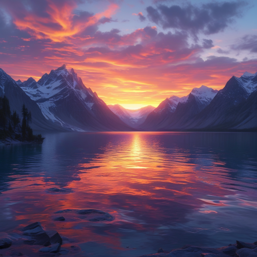 A stunning sunset paints the sky in vibrant shades of orange, pink, and purple, reflecting gracefully on the surface of a calm, glass-like lake. Towering majestic mountains frame the scene, their silhouettes softened by the fading light. This breathtaking view captures a moment of peace and natural harmony, evoking feelings of awe and serenity.