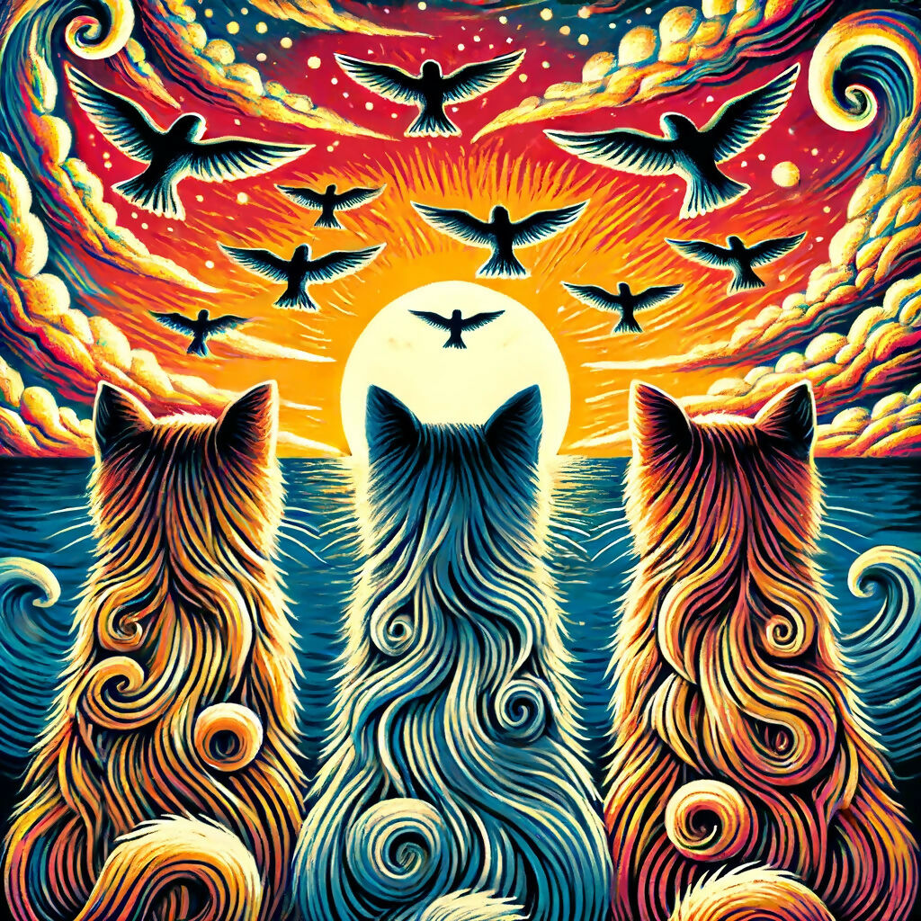 In this surrealist scene, three cats sit side by side with their backs to the viewer, gazing at a vibrant and whimsical sunset. Birds fly in formation across the sky, creating a captivating and dreamy atmosphere. The swirling colors and intricate details bring a sense of magic and wonder to the moment of peaceful observation.