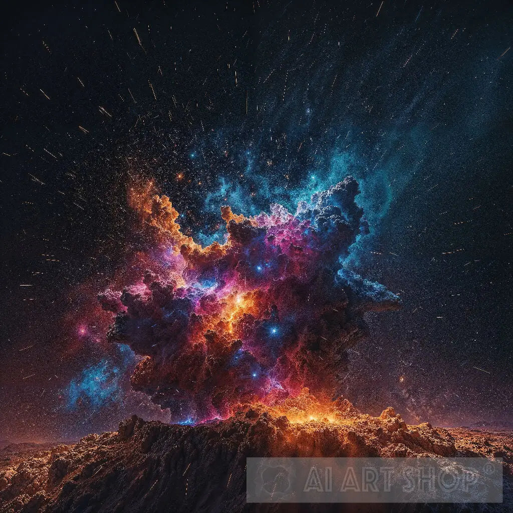 Colors formed by the explosion of a star near the surface of a planet. Inspired by a song from the group Orbital. Neon colors and fine lines in space and the clouds make for a bold and nuanced spacescape.
