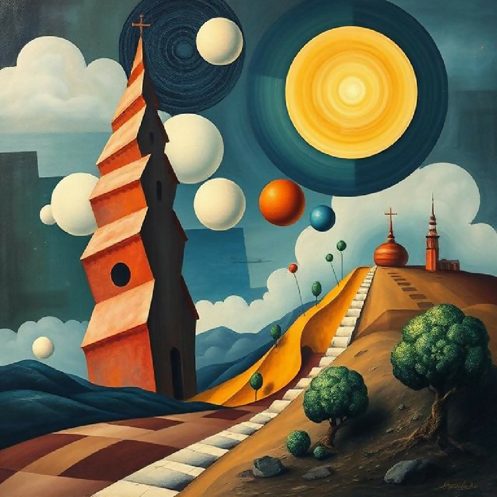 This imaginative artwork presents a dreamlike landscape where reality bends and the laws of physics seem suspended. A winding path leads up a golden hillside toward two whimsical, church-like towers—one of which leans at impossible angles, defying gravity. The sky is filled with floating spheres and a radiant, oversized sun encircled by concentric rings, lending the scene a cosmic, otherworldly feel. Stylized trees and rolling hills add to the sense of depth and wonder, creating a surreal world that invites viewers to explore its mysteries and symbolism.