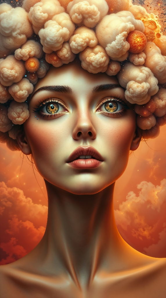 A breathtaking AI-generated surreal portrait featuring a woman with celestial cloud hair and radiant golden eyes. This high-resolution artwork blends sci-fi beauty with cosmic dreamscape — perfect for collectors and decor lovers