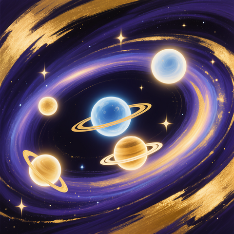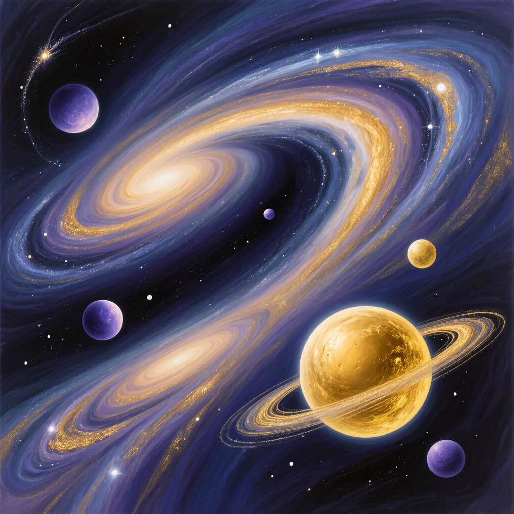 “A cosmic-inspired wall art featuring flowing galaxies, glowing planets, and abstract brush strokes in deep indigo and golden hues. A surreal blend of science and art for modern interiors.”