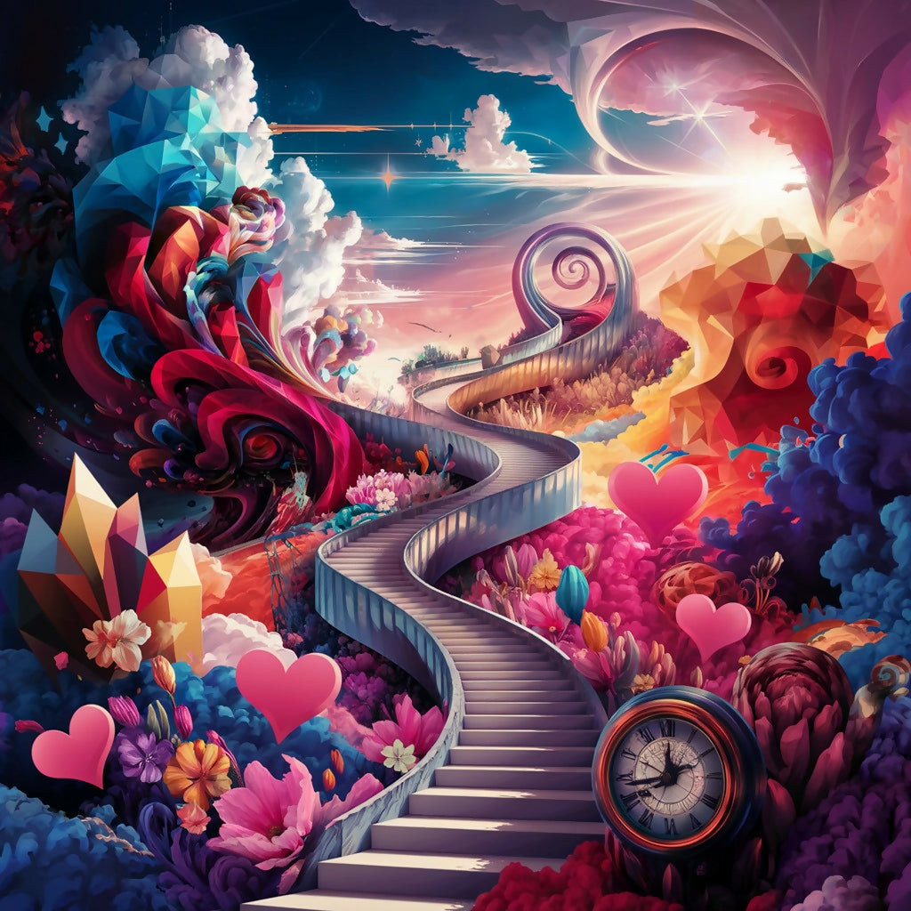 A Surrealistic Dreamscape with bright colors, an ethereal effect, clocks and a winding staircase in pink and lavender clouds.