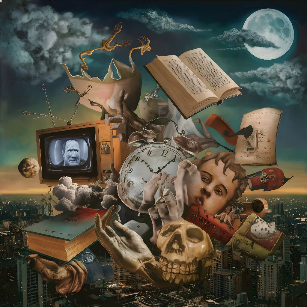 This surrealist artwork depicts a chaotic dreamscape that explores themes of time, knowledge, and mortality. At the center, a distressed face grapples with a large clock, symbolizing humanity's struggle with the passage of time. Surrounding this central figure are various objects loaded with meaning: books and scrolls represent knowledge and history, while a skull reminds us of our mortality.