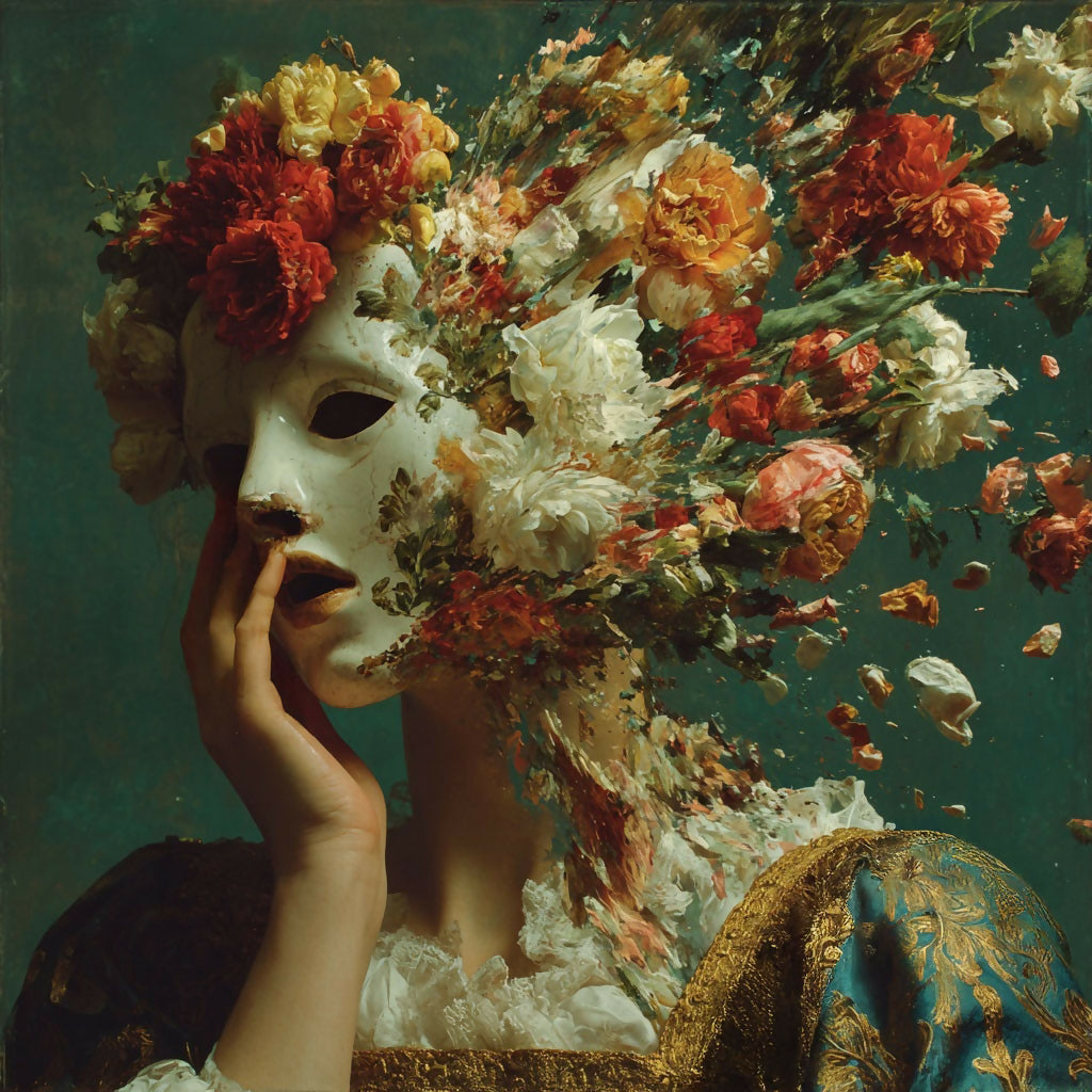 This is a surreal rococo portrait of a woman holding a porcelain mask that is that is exploding into flowers. It is a moody fine-art fantasy dealing with the themes of identity and transformation. It is finely detailed with a painterly texture and a teal backdrop.