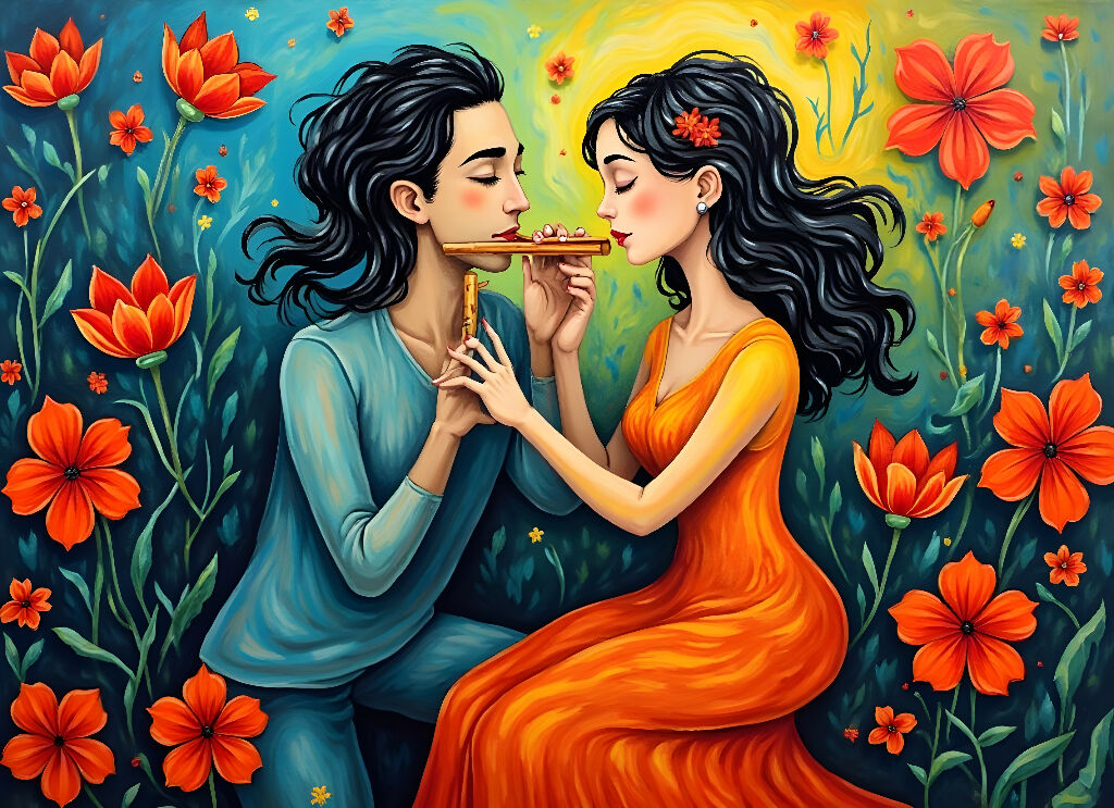 A vibrant surreal digital painting depicting a young man and woman seated together among oversized orange flowers and lush green leaves. Both figures have long, flowing black hair, enhancing the dreamlike, fantasy aesthetic. The man, dressed in a blue shirt, gently plays a small flute, while the woman, wearing a flowing orange dress, gazes at him with a calm, romantic expression. Behind them, a colorful, ethereal sky glows with a radiant yellow sun and scattered red floral elements, adding depth and warmth to the composition. The artwork blends surrealism, fantasy, and romantic illustration styles, creating a whimsical, poetic scene filled with harmony, emotion, and visual storytelling—ideal for AI-generated art galleries and modern digital art collections.