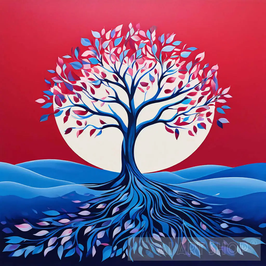 This captivating AI-generated artwork features a vibrant tree with striking blue roots that wind through water. The tree itself boasts stunning pink leaves that contrast beautifully with the red background and clear blue sky. This piece is sure to spark conversation and would make a unique addition to any home or office.
