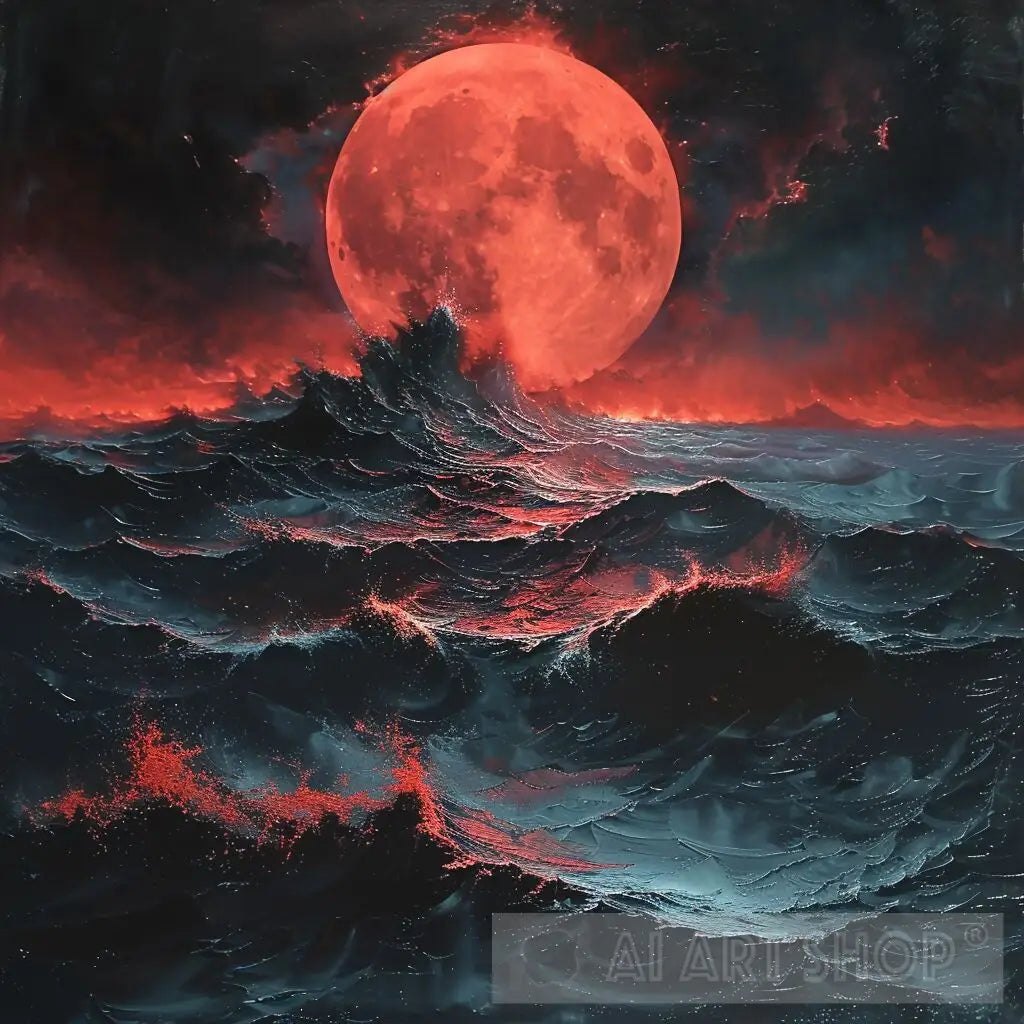 A surreal stormy sea under a blood-red moon, depicted with dark reds, midnight blues, and black.