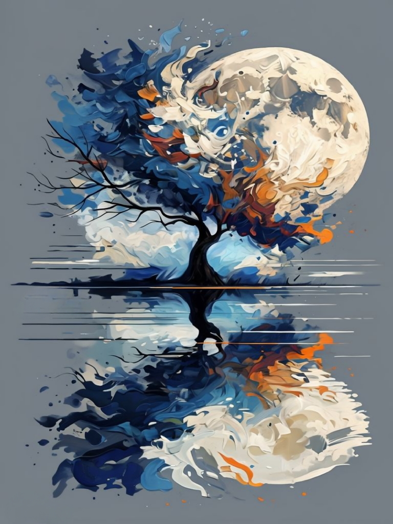 A mesmerizing piece of abstract digital art showcasing a surreal tree standing in the middle of a reflective surface. The tree is beautifully split into warm, fiery colors and cool, serene tones, symbolizing balance and duality. The backdrop features a glowing full moon, adding an ethereal and dreamy touch to the composition. This artwork combines nature, reflection, and abstract expressionism, making it a captivating addition to any digital art collection.